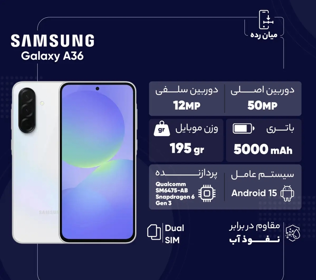 گوشی موبایل سامسونگ مدل A36 با حافظه 256 گیگا بایت و رم داخلی 8 گیگا بایت